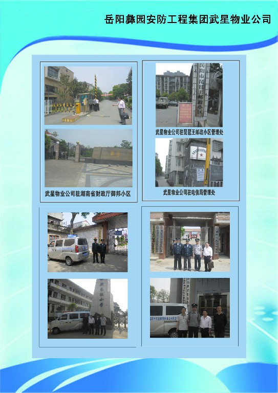 岳陽武星物業(yè)管理有限公司繼岳陽市武星保安公司于2012年2月成立,武星保安公司是經(jīng)省公安廳批準(zhǔn)成立的民營保安公司,為滿足廣大客戶的迫切要求,公司能為客戶提供保安、物業(yè)整體服務(wù)。武星物業(yè)公司技術(shù)力量雄厚,有電梯維修工程師、園林綠化師、水電安裝工程師、消防等專業(yè)技術(shù)人才。為了更好地服務(wù)社會、培育特種人才,公司與岳陽市巴陵職業(yè)技術(shù)學(xué)校聯(lián)合辦學(xué),開設(shè)了保鏢保安武術(shù)散打班、物業(yè)管理班、園林綠化技術(shù)班、水電維修班、禮儀班,現(xiàn)有專業(yè)學(xué)員幾百名。公司為各黨政機(jī)關(guān)、社會團(tuán)體、廠礦企事業(yè)單位、金融機(jī)構(gòu)、房地產(chǎn)開發(fā)商居民住宅、賓館、學(xué)校、娛樂場所等提供人力資源和技術(shù)防范服務(wù)。目前公司有幾十家大客戶,公司優(yōu)質(zhì)的服務(wù)得到了客戶的好評?,F(xiàn)經(jīng)公安廳市公安局批準(zhǔn)成立了保衛(wèi)科、督查應(yīng)急大隊(duì),為客戶不定時(shí)的服務(wù)和回訪,公司有一批業(yè)務(wù)精、能力強(qiáng)的管理人才,為客戶提供高質(zhì)量的服務(wù)。武星保安物業(yè),保您家安樂業(yè)。